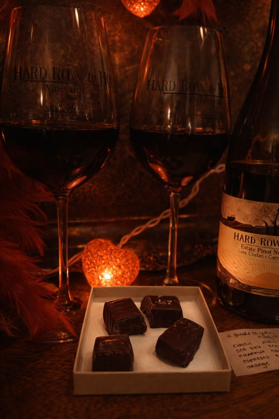 Love is in the air… and so is the intoxicating aroma of handcrafted chocolate and estate-grown wine! This February, step into the Hard Row to Hoe Vineyards tasting room for a one-of-a-kind Valentine’s experience. We’ve got a special selection of handmade chocolates to try with our curated selection of red wine. Available everyday, all month long!